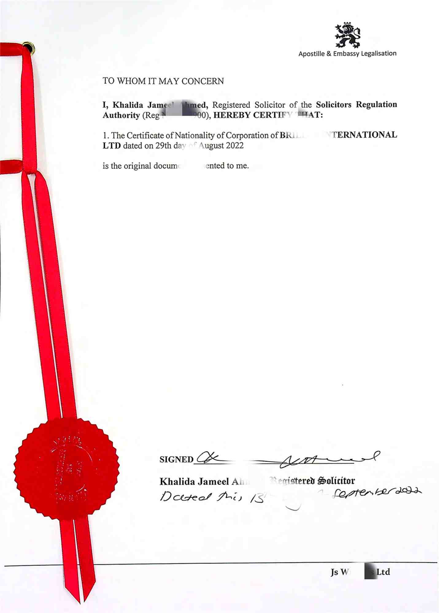 3、對英國注冊證書,董事股東名冊,銀行資信證明的公證及使館認(rèn)證